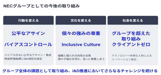 ただ、我々自身も改善を積み重ねながら「インクルーシブな文化を作っていく」ことに向かって走っていきたいですし、野望ということで申し上げますと、NECグループのみならず、社会に向けて知恵を出し合いながら、日本全体で良くなるように進めていけたらと思っております。