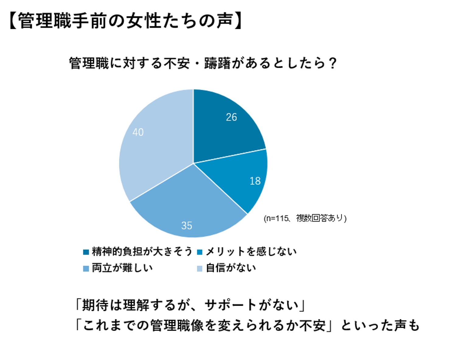 さらに、管理職に対するイメージ…例えば「長時間労働」「突発対応が常時求められる」「ビジョンを示し、率いていかなくては」といったものが強く、「期待してもらえるのは嬉しいが、『能力がない』という判断をされるのでは」という不安を抱える方も多いこともわかりました。