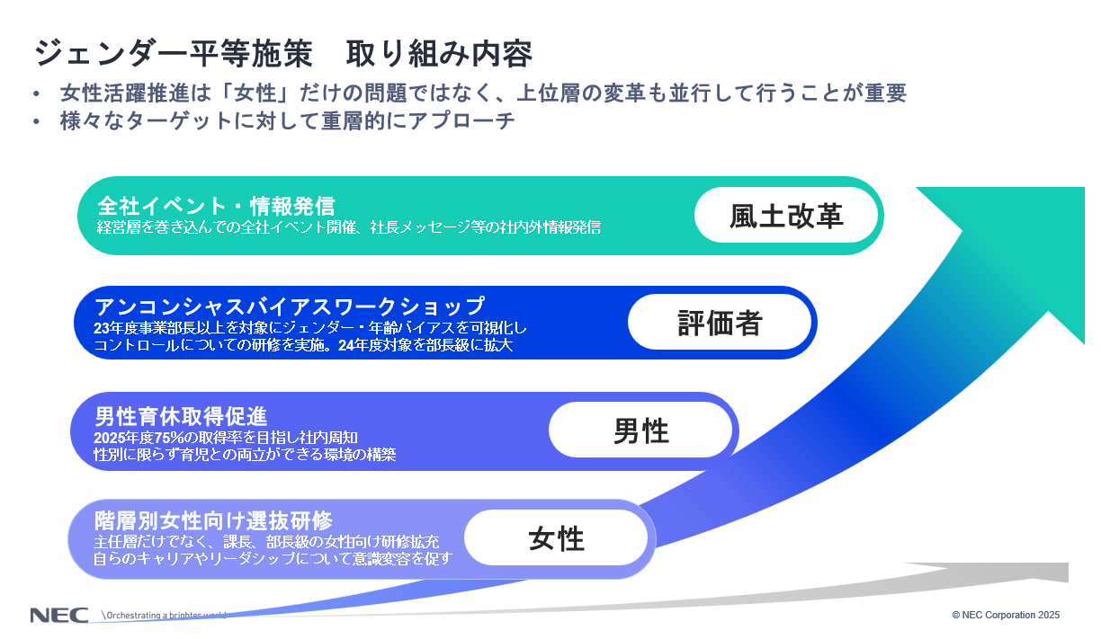 女性を対象とした施策だけでなく、機会提供や評価軸、登用していく管理職や上長のバイアス対処など、多層的に展開し、組織全体の変革に地道につなげていくことが必要ですし、そうした意味で、NECソリューションイノベータ様の取り組みをぜひご紹介したいと考えています。
