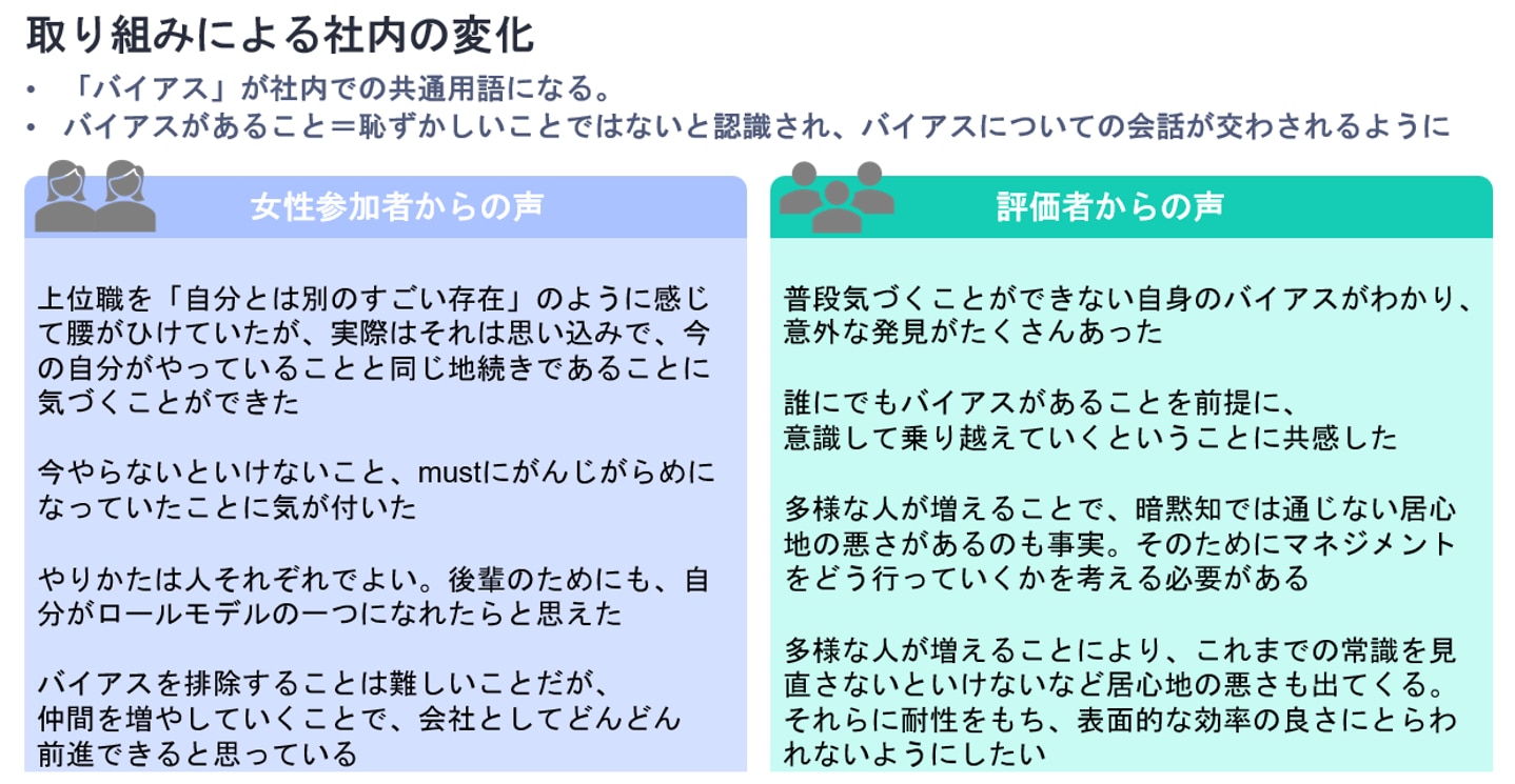 その際、アンコンシャス・バイアスが可視化できたというのは非常にインパクトがあったなというふうに思っております。「バイアスは、ない」と思っている状態が一番危ないと感じていたからです。